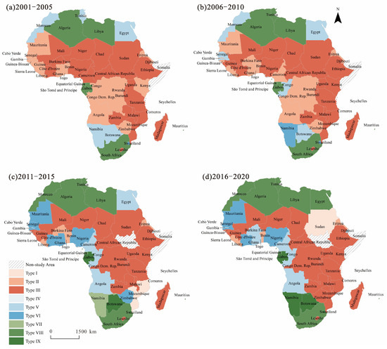 The division results of coupling coordination types are shown in Table 4 and Figure 4. As a whole, Northern and Southern Africa exhibit higher levels of coordination, while Eastern and Western Africa demonstrate relatively lower levels of coordination. From 2001 to 2020, although the number of African countries in a state of uncoordinated development decreased from 38 to 25, most African countries are still in a state of uncoordinated development, with Burundi and Chad having the lowest coupling coordination degree. At the same time, the number of countries with a coordinated development status increased from 7 to 13, with Seychelles and Mauritius having the highest coupling coordination. During these two decades, most African countries have been in a state where economic development lags behind urban population growth. On the other hand, the number of countries in a state of high-quality coordinated development (Type IX) has only increased from 0 to 4, accounting for less than 10% of the total.