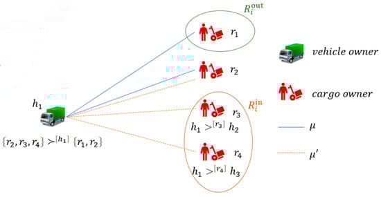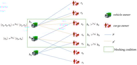 Equation (9) requires that the set contains at least one vehicle owner and one cargo owner. Equation (10) stipulates that in , each vehicle owner in can only be matched with cargo owners in and those already matched to them in . Equation (11) requires that cargo owners in can only be matched with vehicle owners within . Equations (12) and (13) require that all individuals in prefer their matches in over those in .