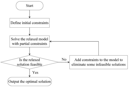 - Based on the characteristics of the model, an improved cutting-plane algorithm is designed to solve the model. The group stable matching model for the freight pooling business on vehicle–cargo matching platforms established in this paper is a mixed-integer linear programming model. Since the model is an NP-hard problem, the number of constraints reaches , which severely impacts the solution efficiency of the group stable matching problem for the freight pooling business on vehicle–cargo matching platforms. At the same time, the model has only m⋅n decision variables, which is much smaller than the number of constraints, indicating that the majority of the constraints are ineffective. Therefore, this paper introduces the cutting-plane algorithm and improves it for the specific problem at hand. This modification allows for the removal of most ineffective constraints during the solving process, using only a subset of the model’s constraints to obtain the same solution as the original model. This significantly improves solving efficiency and is highly suited to the characteristics of the model.