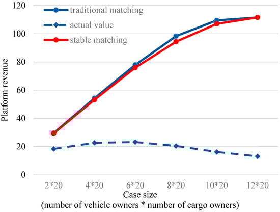 As shown in Figure 5, under the condition where the number of cargo owners remains constant and the vehicle owners’ capacity gradually exceeds demand, the platform’s ideal revenue continues to increase for both matching modes, with only a small difference. However, the issue of declining platform revenue in the traditional matching mode is particularly noteworthy. The core difference between the traditional matching mode and the stable matching mode lies in the stability of the matching solution and the handling of blocking coalitions. The traditional matching mode often involves a larger number of blocking coalitions, which means that in certain cases, the matching between cargo owners and vehicle owners may not be mutually optimal, leading to potential revenue loss. In contrast, the stable matching mode ensures matching stability, thereby avoiding such situations and aligning the platform’s ideal revenue with its actual revenue.
