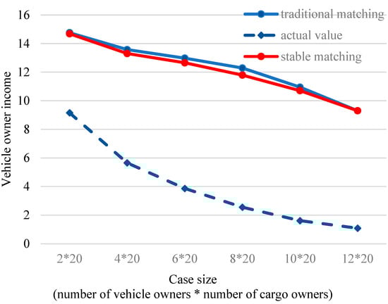 From the vehicle owner’s perspective, as the number of vehicle owners increases, the competitive pressure also rises, which directly leads to a decrease in the average ideal income of vehicle owners. However, although in the stable matching mode, the vehicle owner’s actual income is the same as the ideal income, in the traditional matching mode, vehicle owners face significant income loss. Moreover, in the traditional matching mode, as the number of vehicle owners increases, the income loss of vehicle owners becomes even more severe.