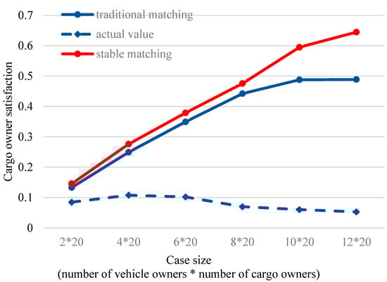 Figure 7 reveals that as the number of vehicle owners gradually increases, cargo owners’ ideal satisfaction steadily rises, indicating that the increased market supply can better meet cargo owners’ demands for vehicle owners. However, changes in market supply and demand have a significant impact on cargo owners’ actual satisfaction. Due to its inability to ensure matching stability, the traditional matching mode may result in cargo owners facing mismatched solutions when there is an oversupply of vehicle owners, leading to a decline in actual satisfaction. The stable matching mode demonstrates a clear advantage in enhancing cargo owners’ actual satisfaction, particularly when the number of vehicle owners is large.