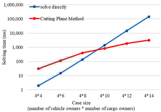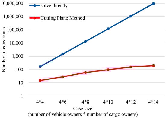 To validate the effectiveness of the proposed cutting-plane method in improving the computational efficiency of solving the group stable matching problem, this section conducts experiments on instances of varying sizes. Specifically, we compare two approaches: one that applies the cutting-plane method to solve a simplified version of the group stable matching model and another that directly formulates and solves the complete group stable matching model without employing the cutting-plane technique. Both approaches utilize the same optimization solver for solving the mixed-integer linear programming (MILP) models. The computational time and memory usage (measured by the number of constraints generated during the solution process) for solving the one-to-many stable matching problem on the vehicle–cargo matching platform using the two approaches are shown in Figure 8 and Figure 9, respectively. It is important to note that both figures use a logarithmic scale on the vertical axis.