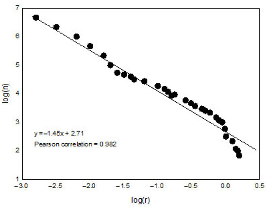 It is worth noting that the topological dimension of a point is 0, the topological dimension of a continuous line is 1, and the topological dimension of a surface is 2. The topological dimension of the edge of an irregular, fragmented object (such as cancer or a city) is a fraction somewhere between 1 and 2. It is a “fractal pattern”; this fractal pattern is independent of the scale and is generated from the slope of the line (in logarithm scale) of the relation between the unit length of a ruler and the number of units necessary to cover the object. When in the presence of a fractal object, the length of the edge does not reach a finite limit (expressed in terms of the number N of units of the ruler) but negatively scales with the ruler unit because the smaller the unit length, the higher the number of the “turns” and, thus, the higher the perimeter value [61]. Figure 2 reports an example of fractal scaling.