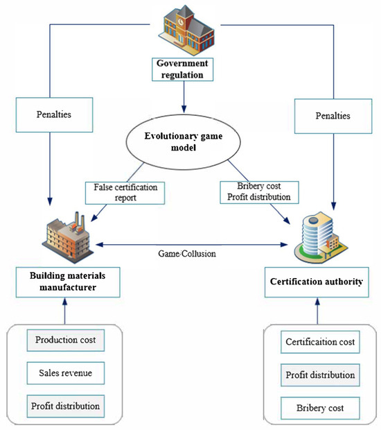 Green building materials have comprehensive benefits for the environment, economy, and society [77]. However, the production of green building materials requires additional costs such as green production and technological innovation, and the benefits of green building materials are low. Some building material enterprises may implement greenwashing behavior to maximize their own interests. When building material enterprises implement greenwashing behavior to produce greenwashing building materials that do not meet the requirements, they may bribe certification institutions to issue false detection reports to pass the certification. During the certification process, the certification institutions are responsible for the professional testing of building materials in accordance with relevant regulations and are able to identify the greenwashing behavior of building materials companies. However, to reduce costs as much as possible and maximize their own interests, certification institutions may give up fulfilling their social responsibilities and collude with building material enterprises. Therefore, this paper incorporates building material enterprises and certification institutions into the evolutionary game model and considers the evolution mechanism of the greenwashing behavior of building material enterprises and the collusion behavior of certification institutions under prospect theory. The game relationship between the two is shown in Figure 1.
