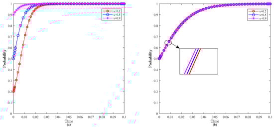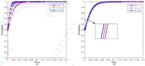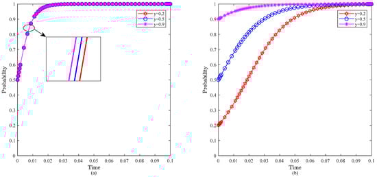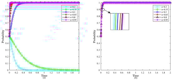 Figure 4a illustrates that for the building material enterprise, as the marginal decreasing degree of the value function of perceived profits and losses for the decision makers gradually increases, gradually changes from the result of converging to 0 to converging to 1. There is a critical value between 0.35 and 0.5. When is less than this critical value, converges to 0. When is greater than this critical value, converges to 1, and the larger the value is, the faster the convergence speed. Figure 4b illustrates that for the certification institution, as the marginal decreasing degree of the value function of perceived profits and losses for decision makers gradually increases, always converges to 1, and an increase in will not affect the final state of . The greater the value of is, the slower the convergence rate.