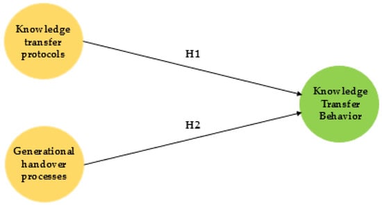 Generational handover procedures contribute to improved organizational performance, enhancing the organization’s positioning in the labor market [12,67,68]. Such efforts are essential to maintaining organizational outcomes in an increasingly dynamic labor market [43]. Given that talent shortages affect organizations worldwide, the creation and implementation of effective knowledge retention systems are crucial [69]. Thus, the aim of this research is to explore the relationships between knowledge transfer and generational handover processes and employees’ knowledge transfer behaviors, as well as to examine the associations between these behaviors and key organizational factors related to organizational outcomes. The novelty of this study stems from its exploratory analysis of the relationship between knowledge transfer and generational handover processes and employees’ knowledge-sharing behaviors. It also employs a correlational design, using structural equation modeling to test theoretically grounded directional relationships between knowledge transfer behaviors and key organizational outcomes. This study emphasizes the strategic relevance of developing protocols for knowledge transfer and generational succession to enhance knowledge retention and organizational outcomes. Thus, this study has the following hypotheses: