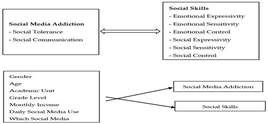 The relational and descriptive survey model, one of the quantitative research methods, was used as the research technique. The relational survey model is the model used by researchers to measure the level of a relationship between two or more variables [46]. The model shown in Figure 1 was created to determine the relationship between the social media addiction levels and social skill levels of university students and whether there is a significant difference in social media addiction and social skill levels according to demographic characteristics.