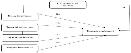 The model uses gross domestic product per capita as the dependent variable. In contrast, the explanatory variables consist of energy, transport, pollution, and resource tax revenues (Table 1). This framework and hypotheses were developed following the research cited in [28,40]. To explore the impact of environmental taxes on economic development, several key hypotheses were formulated. These include the primary hypothesis and additional auxiliary hypotheses. This study aims to assess how energy, transport, pollution, and resource taxes influence economic development. The null hypothesis is as follows: