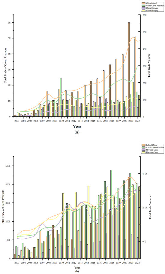 Total bilateral trade volume and green bilateral trade volume for China and V4 countries from 2003 to 2022 (unit: thousand USD); (a) China to V4; (b) V4 to China. Note: The bar chart represents the trade volume of green products, and the line chart shows the total trade volume. The data were compiled by the authors based on the CEPII-BACI database. The figure was drawn using Origin software (Origin 2021).