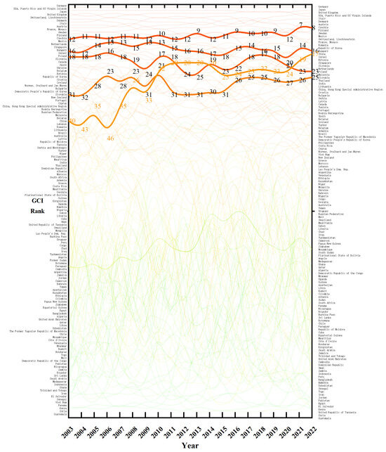 Second, on the basis of the PCI calculation results, GCI is used to measure the extent to which an economy can competitively produce technologically advanced green products. GCI is usually used as a proxy variable to measure a country’s green production capacity. Figure 2 shows the GCI rankings of 142 countries and regions around the world during the 20-year period from 2003 (left axis) to 2022 (right axis). It maintains methodological rigor by adopting the full-sample computation approach outlined by Mealy and Teytelboym [8], which effectively mitigates the selection bias that can arise from using partial samples. Furthermore, Figure 2 highlights the dynamics between China and the V4 countries through deliberate visual encoding; bold streams represent China and the V4 nations, while low-opacity streams illustrate the other countries. This design effectively conveys their relative positions on the global stage and their evolutionary trajectories.