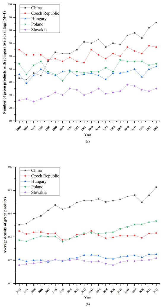 Figure 3 illustrates the time series evolution of the number of green products with comparative advantages and the average relatedness density of green products of China and the V4 countries over the 20-year period. As shown in Figure 3a, while the green comparative advantage of V4 countries showed slight, stable fluctuations with a slight increase, the number of China’s green products with comparative advantages increased rapidly. Notably, there was a 1.4-fold increase from 2006 to 2008, during which China rose from 46th to 26th in the green economy complexity ranking globally (Figure 2), indicating that the diversification of the green export basket is closely related to the increase in green production capacity.