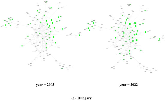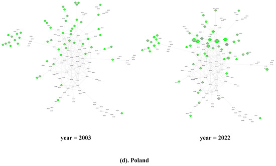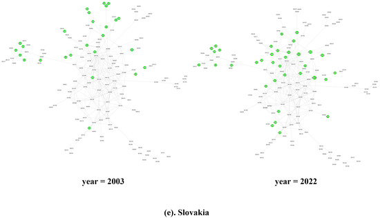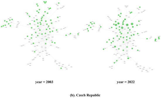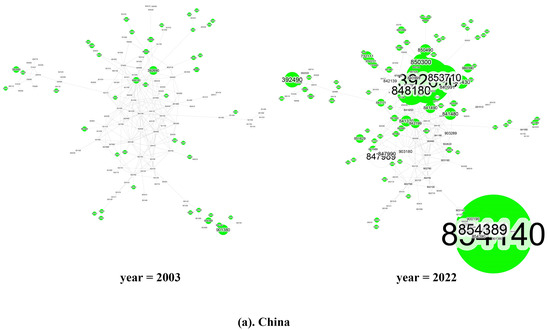 Looking at individual countries, as illustrated in Figure 4, in 2003, most of China’s green products with comparative advantages were distributed in the periphery of the product space (see Figure 4a). Among them, HS901380 other liquid crystal display panels (Section XVIII, PCI = 0.586) located in the lower right corner and HS392690 other plastic products (Section VII, PCI = 0.718) in the core area were the two products with the largest export volume in 2003. These were close to or directly related to the two products with the highest complexity among the export products in that year, HS 854389 other single-function motors and equipment (Section XVI, PCI = 0.983) and HS848180 other valves in (Section XVI, PCI = 1.184). In 2022, the evolution of the structure of China’s green product space also included a significant trend of rapid growth in the export volume of advantaged products. In the lower right corner of the product space, the export volume of HS854140 other photosensitive semiconductor devices including solar cells (Section XVI, PCI = 0.681), located between HS901380 and HS854389, increased rapidly, which was closely related to the continuous accumulation of international competitive advantages through technological innovation in China’s solar photovoltaic industry, improving photoelectric conversion efficiency and reducing costs in recent years. The core area continued to revolve around HS392690 and HS848180, with the emergence of new growth points of competitive advantage, such as HS853710 electronic injection ignition program controllers (Section XVI, PCI = 0.666).