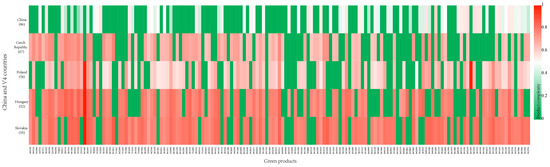 The distribution of product distances reveals the complementarity of green industrial structures between China and V4 countries, which is described as follows: (1) The complexity distribution of China’s green products is already quite comprehensive, and the level of green diversification is in the leading position, but there are not many high-complexity green products with comparative advantages; green products with comparative advantages in V4 countries are concentrated in medium- and high-complexity regions. (2) China has complementary advantages with the V4 countries in low- and medium-complexity regions. For example, the distance heatmap of green products such as HS841440 air compressors mounted on the trailer chassis (PCI = −0.423) shows that, owing to their limited production capacity endowment, Poland, Hungary, and Slovakia are unlikely to include this product in their production systems in the future. (3) In high-complexity regions, we can similarly explore opportunities for industrial complementarity with V4 countries for products with comparative advantages. For example, Poland is far from having a comparative advantage in products such as HS841490; hence, technology and trade cooperation in related products can be launched. Our efforts can be concentrated on the products shown in light green in Figure 5, which present less competitive advantage in V4 countries; these include HS902750 other instruments and devices using optical radiation (PCI = 1.736) and HS902790 microtomes and parts of physical/chemical analysis instruments (PCI = 1.719). Such technological innovation can be undertaken with the aim of achieving breakthroughs in independent core technologies. In particular, none of the five countries currently has a comparative advantage in HS901320 other lasers (PCI = 1.515), but China has the shortest distance to gain a comparative advantage. Therefore, China may gain a potential competitive advantage in this product in the future. For products shown in red in the figure, we can seek technical cooperation with the V4 countries that have relevant production capacities. For example, we could jointly develop HS902730 spectrometers and other related products with the Czech Republic; explore the development of products related to HS902780 other physical and chemical analysis instruments and devices with Hungary; and engage in technology and trade exchanges with Poland in products such as in HS841950 heat exchangers, HS381519 other supported catalysts, and HS841350 other reciprocating positive displacement pumps.