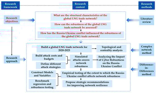 This study addresses three key research questions: (1) What are the structural characteristics of the global LNG trade network? (2) How can the robustness of the global LNG trade network be assessed? (3) How has the Russia–Ukraine conflict influenced the robustness of the global LNG trade network?