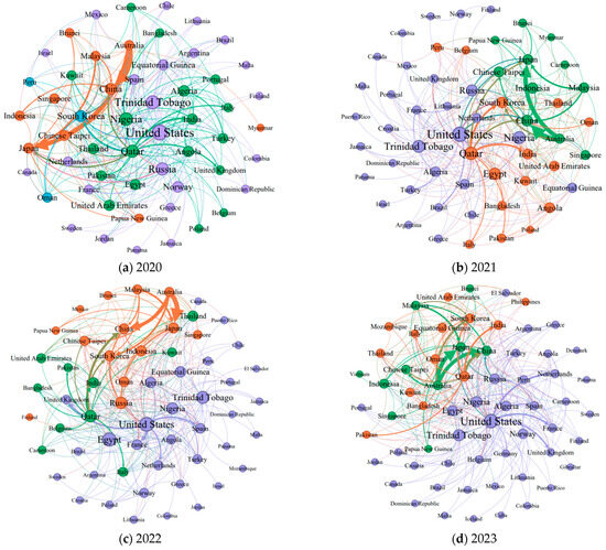 This study uses annual LNG data from the IGU (https://www.igu.org/, accessed on 1 November 2024) and applies data-cleaning techniques to handle missing values and outliers. An adjacency matrix of the global LNG trade network for 2020–2023 was constructed. Using Gephi 0.10.1, directed graph models were developed for each year’s LNG trade network. In these models, nodes represent countries or regions, with node size corresponding to their degree within the network. Arrows indicate the direction of LNG trade, pointing from exporting to importing countries. The thickness of the arrows reflects trade volume, indicating the intensity of trade relationships. Different line colors represent distinct modular groups, illustrating regional divisions within the network.