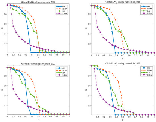 Nonetheless, several limitations should be noted: (1) The research period from 2020 to 2023 may not fully capture the long-term impacts of the Russia–Ukraine conflict. Previous studies suggest that the conflict has triggered more profound structural shifts and prolonged regional instability [27,28], which may further affect network robustness beyond the study’s time frame. Future research could extend the observational window to assess delayed or cumulative effects. (2) Although the analysis is based on authoritative data from the IGU LNG Annual Reports, potential gaps in data coverage or reporting delays could influence the results’ accuracy and generalizability. Incorporating high-frequency or near-real-time data from sources such as the IEA or satellite-based tracking platforms could enhance future analyses regarding precision and timeliness. (3) This study does not account for Russia’s LNG fleet expansion strategy, which could enable it to bypass Western sanctions and reshape trade dynamics. Due to data limitations and scope constraints, this factor is excluded from the current analytical framework. Future research could integrate maritime tracking data or fleet deployment records to more accurately assess its implications for network robustness.