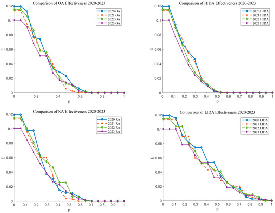 - Optimal Attack (OA) Strategy: This strategy is derived from the optimized attack model described in Section 4.5 and Section 4.6, incorporating network topology, node centrality, and attack cost. It aims to maximize disruption at minimal cost, reflecting extreme cases such as targeted cyberattacks or aggressive market competition.
