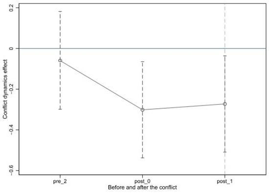 Here, Ds denotes a set of time dummies with the subscript s ranging from −2 to 1. Negative values indicate pre-conflict years, positive values represent post-conflict years, and s = 0 corresponds to the year the conflict began. The year immediately prior to the conflict (s = −1) is used as the baseline to avoid multicollinearity.