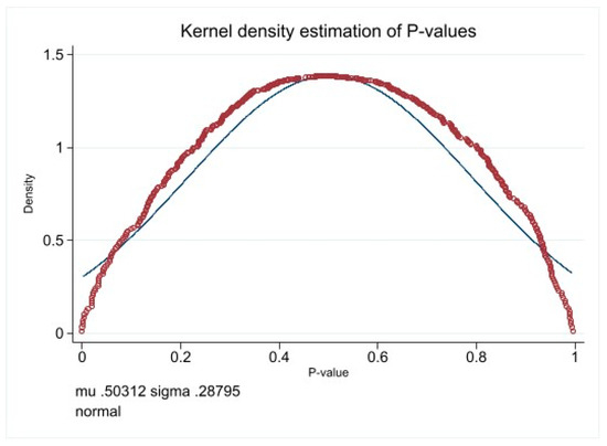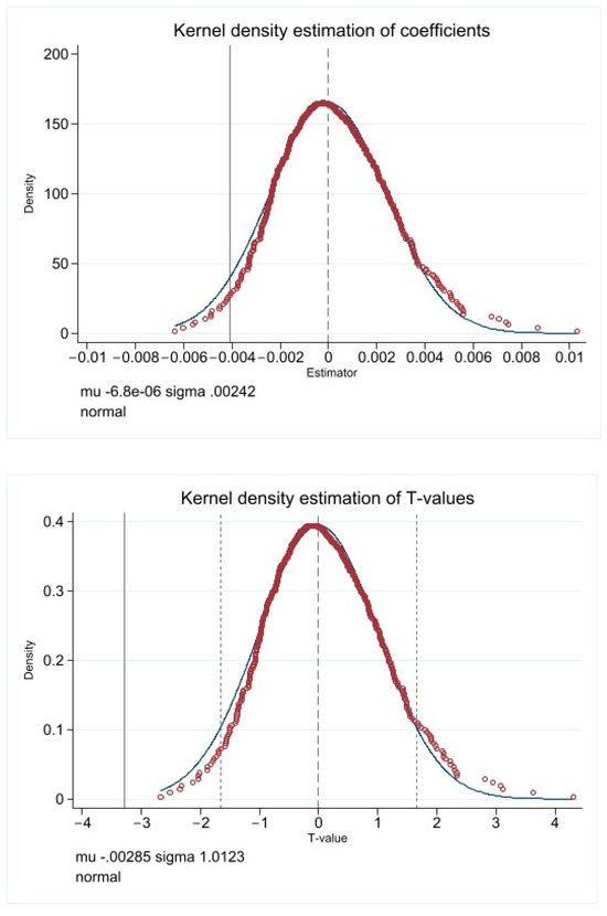 To address concerns about potential bias from unobserved factors, a placebo test is performed using a counterfactual setup. The sample is randomly split into pseudo-treatment and pseudo-control groups, and the baseline regression is re-estimated. This process is repeated 500 times, and the distributions of the estimated coefficients, t-values, and p-values are plotted using kernel density estimation. As shown in Figure 7, the simulated coefficients follow a normal distribution centered around zero and deviate substantially from the observed DID coefficient (−0.0040813). Moreover, the t-values and p-values generated from the placebo tests are statistically insignificant, while the actual t-values are considerably larger and the p-value markedly lower than those of the simulated results. These findings support the conclusion that the observed treatment effect is not driven by random variation or omitted variables but reflects a genuine causal impact of the conflict.