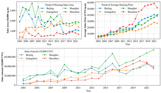 The empirical analysis in this study utilizes real estate market data from the period 2003–2022, published by the National Bureau of Statistics, for the super-first-tier cities. These data are used for a preliminary validation of the research framework for real estate market forecasting models. The market scale and potential are primarily measured by indicators such as sales revenue of commercial housing [20], sales area [19,50], and average sales price [51]. Descriptive statistics of these indicators are presented in Table 2, with their time trends shown in Figure 2.