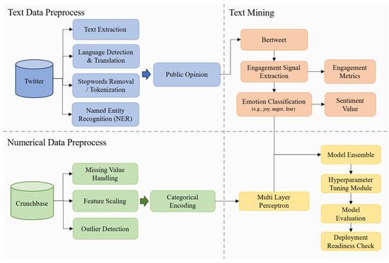 Figure 1, the framework combines text data from social media (e.g., Twitter) and structured numerical data (e.g., Crunchbase). The text pipeline involves natural language processing and sentiment analysis using a pre-trained transformer (Bertweet), while the numerical pipeline handles missing values, scaling, and encoding. Both data streams are fed into a multi-layer perceptron for prediction. The model is further enhanced through ensemble learning, hyperparameter tuning, and evaluation, with additional modules for interpretability and deployment readiness.