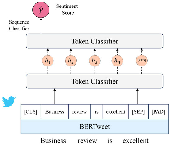 To effectively extract sentiment features from social media texts, this study adopted the BERTweet model, which is a variant of the BERT (Bidirectional Encoder Representations from Transformers) model, specifically optimized for Twitter data. The model architecture is the same as BERT, utilizing the Transformer structure and bidirectional encoders and capturing internal sentence dependencies through the self-attention mechanism. The training process of the BERTweet model uses a large corpus of Twitter text data to adapt to the language features commonly found in social media, such as abbreviations, emojis, and punctuation.