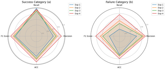 Addition of Social Media Statistical Features (Exp 2): Incorporating social media statistical features into the baseline model significantly improved the Precision and F1 Score for the “Financing Success” category. For the “Financing Failure” category, Recall increased from 0.251 to 0.553, demonstrating that interaction data provided additional external information, enhancing the model’s ability to identify failure cases.
