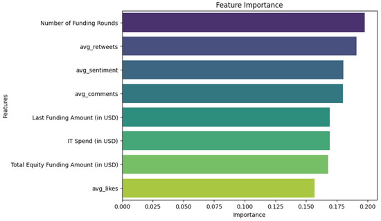 The analysis of feature importance revealed that financial features and social media features complemented each other in the predictive model. Financial features, such as the number of funding rounds, the amount raised in the most recent round, and the total equity financing amount, exhibited high importance in predicting the success of corporate financing. This highlights that a company’s financial records remain a key basis for investment decisions. However, social media features, particularly interaction metrics (e.g., average number of retweets and comments) and sentiment scores, also demonstrated significant predictive power. The features importance ranking are shown in