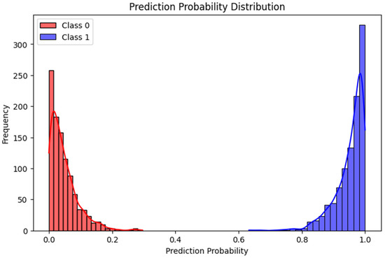 Figure 7, which indicates that the model performs well in classification tasks, accurately distinguishing between companies with successful and unsuccessful financing outcomes. The majority of the failed financing samples had prediction probabilities concentrated near 0, while the successful financing samples were primarily distributed near 1, clearly illustrating the model’s precise differentiation between positive and negative samples. This distribution pattern indicates that the model not only achieved high classification accuracy but also exhibited strong confidence in its decision-making process.