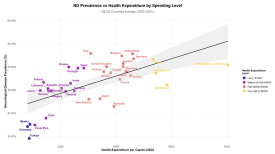 Figure 2 illustrates the relationship between ND prevalence and Health Expenditure per Capita (HEP) across OECD countries. The scatter plot reveals patterns in the data, with countries grouped by their expenditure levels ranging from low (<USD 1000) to very high (≥USD 5000). The visualization shows the distribution of countries across different spending categories and their corresponding ND prevalence rates, with a trend line indicating the overall relationship between health expenditure and neurological disease prevalence.