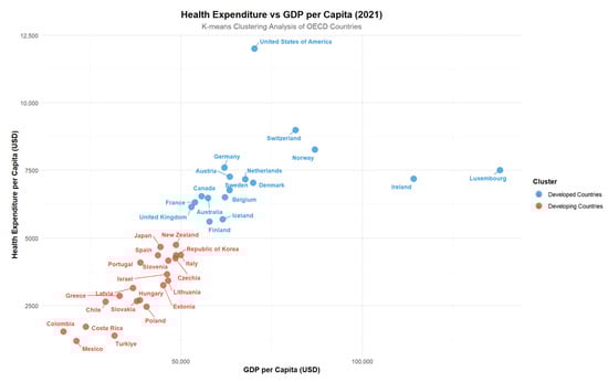 Classification of OECD countries into developing and developed categories using GDP and health expenditures (2021).
