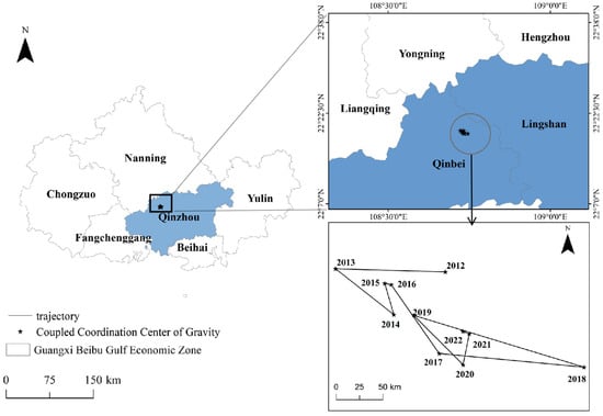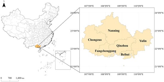 The Guangxi Beibu Gulf Economic Zone (latitude 21°35′–22°41′ N, longitude 107°27′–109°56′ E) is located in China’s southwestern coastal region, comprising six cities: Nanning, Qinzhou, Beihai, Fangchenggang, Yulin, and Chongzuo. Since its establishment in 2008, it has evolved from an economically underdeveloped region into an important international economic cooperation zone, serving as a strategic fulcrum of the New Western Land–Sea Corridor and a core hub for China’s opening to ASEAN (Liao, 2022) [] (Figure 2).