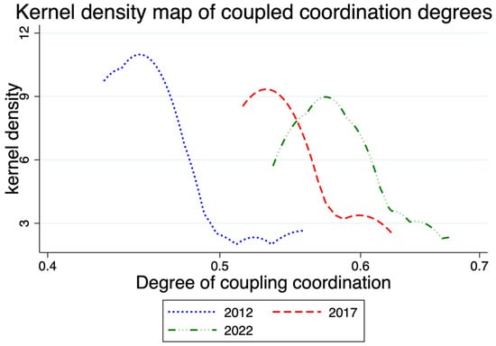 Following the approach of Xu (2023) [], we selected three time points and used the kdensity function in Stata17 to calculate the Gaussian kernel densities of the coupling coordination degree between economic resilience and port logistics in the Guangxi Beibu Gulf Economic Zone for 2012, 2017, and 2022, as shown in Figure 3. Overall, the kernel density curves show significant rightward shifts over the years, with mean coupling coordination degrees of 0.4686, 0.5468, and 0.5905 for 2012, 2017, and 2022, respectively, indicating that the two systems are developing in an orderly manner toward higher coordination; the 2012 kernel density curve peaks around 0.45, indicating that coupling coordination degrees were concentrated at this point during this period, with the highest degree of clustering throughout the sample period, while the peaks for 2017 and 2022 are distributed in the 0.5–0.6 interval.