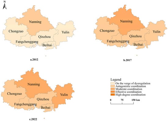 Using ArcGIS 10.8 software, we generated spatial distribution maps of the coupling coordination degree between regional economic resilience and port logistics for 2012, 2017, and 2022, as shown in Figure 4. The coupling coordination degree exhibits significant spatial differentiation characteristics.