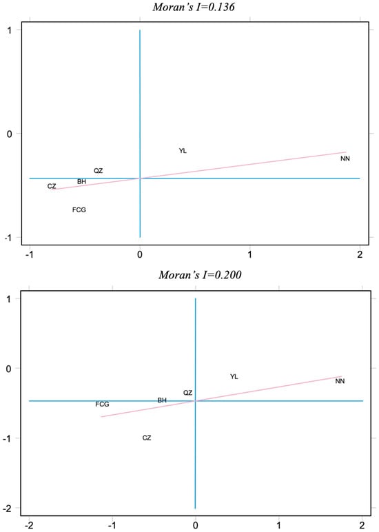 Specifically, Nanning (NN) and Yulin (YL) are located in high–high agglomeration areas. Qinzhou (QZ) is in a “low–high” agglomeration area, indicating that Qinzhou itself has a relatively low coupling coordination degree, but there are high-value areas in neighboring regions. By 2022, its position gradually approached the origin, indicating that as the region’s overall coordination degree improved, Qinzhou port’s hub function was also further released. Fangchenggang (FCG) and Chongzuo (CZ) are located in the “low–low” quadrant, indicating that both themselves and surrounding cities have relatively low coupling coordination degrees. Beihai (BH) is at the boundary between the second and third quadrants, reflecting that its coordination degree is close to the regional average and shows a trend of transitioning toward the second quadrant.