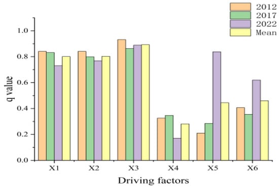 We converted the above six driving factors into discrete variables using the natural breaks method in ArcGIS and entered them along with the explained variable into the geographic detector model, obtaining q-values and significance levels (p-values) for the study area in 2012, 2017, and 2022. All factors passed the significance test (p < 0.001), and by sorting the q-values, we obtained the results shown in Figure 7.