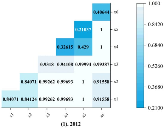 To further explore the influence of interactions between factors on the coupling coordination between regional economic resilience and port logistics, we analyzed data from 2012, 2017, and 2022 using the interaction detection method in the geographic detector, obtaining results as shown in Figure 8. Throughout the sample period, the q-values of all driving factors after interaction were higher than their independent q-values, indicating that the driving effects produced by different driving factors after interaction on the coupling coordination between regional economic resilience and port logistics were all higher than the degree of their independent influence, mainly manifested as two-factor enhancement. Specifically, three characteristics were observed: