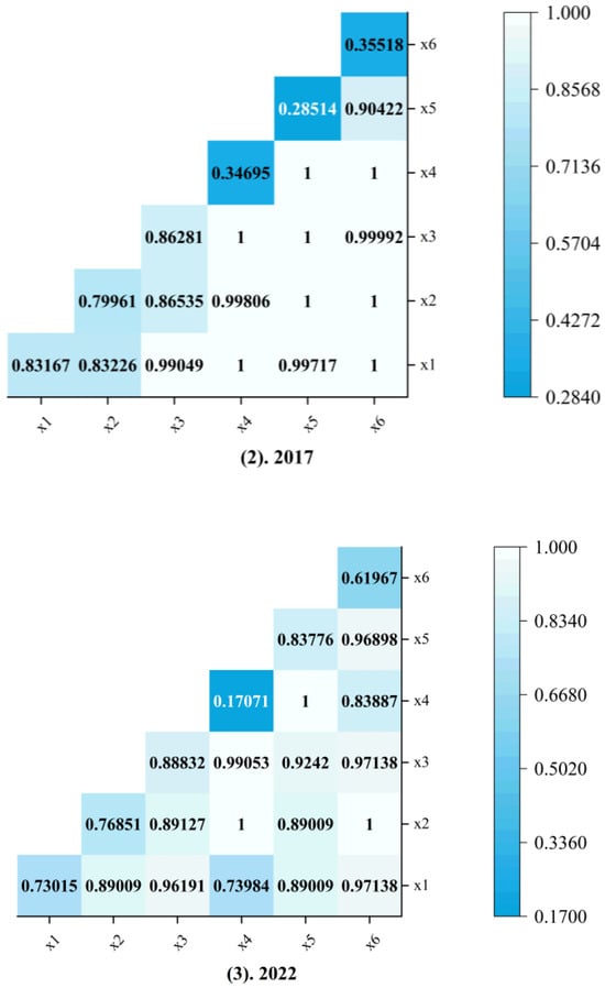During 2012–2022, different driving factors exhibited varying patterns of influence on the coupling coordination between regional economic resilience and port logistics. Except for urbanization level (), which showed a continuous upward trend, all other factors displayed fluctuating states. Information technology level () consistently occupied the primary driving position throughout the sample period (with a mean q-value of 0.89260), demonstrating the strongest explanatory power. This result is closely related to the construction of “smart port” and other engineering projects in the Guangxi Beibu Gulf Economic Zone. The mean q-values for logistics industry employees () and financial development level () ranked second and third, respectively, further revealing the development characteristics of this region’s transition from factor-scale driven to quality-efficiency driven, which aligns with the regional industrial upgrading strategy. The logistics infrastructure level () had relatively weak explanatory power during 2012–2017, but showed significantly enhanced explanatory power in 2022. Combined with the background of the Pinglu Canal construction, this transformation aligns with infrastructure interdependence theory. Urbanization level () saw its q-value significantly surge during the sample period, reflecting the driving role of the new-type urbanization strategy on coupling between regional economic resilience and port logistics. Government support () remained at a relatively low level throughout the sample period, indicating a stage-specific structural mismatch between traditional policy tools and the coupling needs of regional economic resilience and port logistics in this region.
