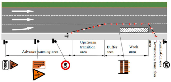 According to the Standardization Administration of the People’s Republic of China [1], the work zone is divided into six elements: advance warning area, upstream transition area, buffer area, work area, downstream transition area, and termination area, as shown in Figure 1 [1]. For simplicity, the first two areas are referred to here as warning and transition areas. The warning area allows drivers to adjust their speeds and change lanes by looking for gaps, making its length crucial for traffic diversion. The transition area helps prevent sudden changes in traffic flow during lane changes, facilitating a smooth transition of vehicles; therefore, its length is significant. Relevant research shows that traffic accidents in the warning and transition areas account for 80% of the total traffic accidents in the work zone [2,3]. Therefore, reasonably setting the warning and transition lengths is essential for improving driving safety and comfort in the work zone.