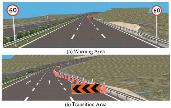 Apart from the warning and transition lengths, all other elements in the experimental scenarios remained consistent. The experimental road was a two-way, six-lane urban expressway with a total length of approximately 8 km and a single-lane width of 3.5 m. The design speed in the basic section was 120 km/h, and the speed limit was 60 km/h. The work zone was arranged following SAC [1], and the work conditions were set for closed outer lane operation (Figure 2).