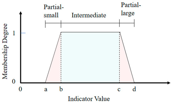 (b) Determine the membership degree: The membership degree of each factor was determined using a trapezoidal membership degree function, divided into three segments: partial-small, intermediate, and partial-large (Figure 4). For the partial-small segment (a to b), the membership degree increased from 0 at a to 1 at b. For the intermediate segment (b to c), the membership degree was 1. For the partial-large segment (c to d), the membership degree decreased from 1 at c to 0 at d. These segments represent the range where the indicator value was considered small, intermediate, and large.