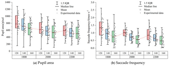 Pupil area (U11, pixel): The pupil area reflected the driver’s comfort level with vision. The pupils will dilate when the visual effect is poor, and the pupils will constrict when the visual effect is good. Meanwhile, the pupil area will also change during the operation, and the magnitude of the change is closely related to the difficulty of the operation [42].