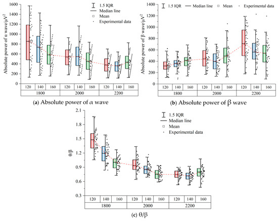 Absolute power of β wave (U22, μV2): The beta waves generally appear when people are stimulated by external events, with intense alertness and high cognitive load. The continuous increase in the absolute power of β waves often indicates that people gradually change from alertness to tension, causing drivers’ fatigue and reducing driving safety and comfort [45].