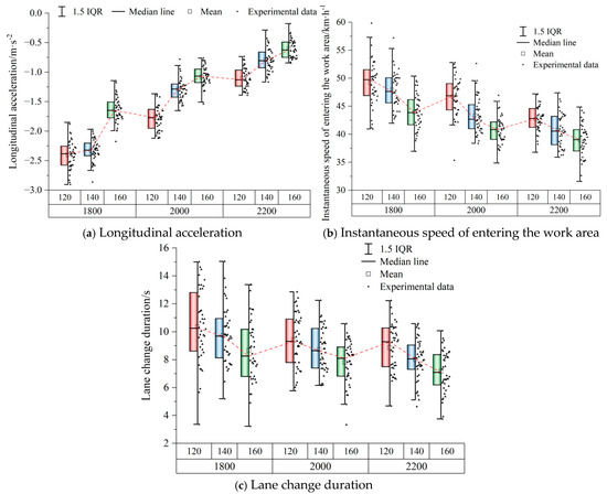 A driver’s vehicle handling behavior can also reflect driving safety and comfort to some extent. This behavior includes controlling vehicle speed, controlling the driving route, and handling emergencies. It indicates that the driver’s driving safety and comfort are poor if they frequently change lanes, speed, or brake suddenly [34,35]. Therefore, vehicle handling behavior can also characterize driving safety and comfort during the driving process in the work zone.