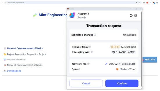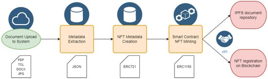 By integrating blockchain technology and NFTs, we create a decentralized, immutable record of a building’s life cycle. This Digital Twin approach enhances transparency, facilitates regulatory compliance, and ensures that every modification remains securely documented and verifiable by relevant stakeholders. Figure 2 shows a simple flowchart of the tokenization and documents registration processes on blockchain.