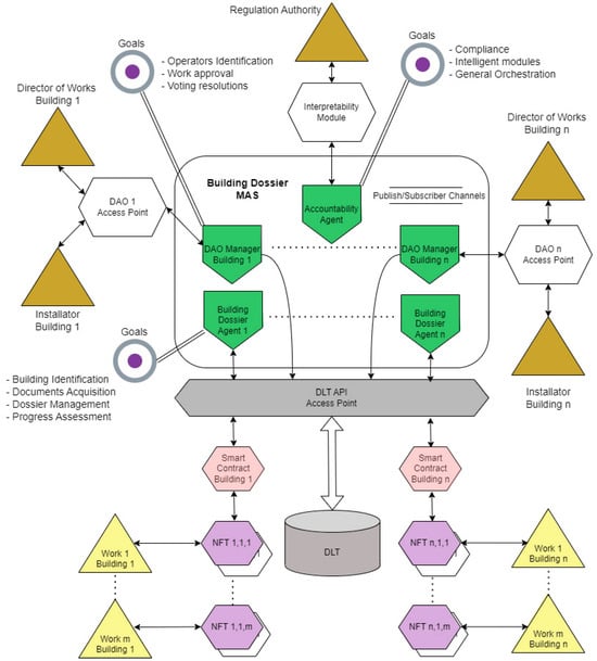 Coming to the architecture, at the top level, a Multi-Agent System (MAS) coordinates the management of Building Dossiers at the regulatory authority level (central or local government). The MAS also orchestrates the Decentralized Autonomous Organization systems overseeing work on each building and manages Distributed Ledger Technology functions responsible for handling the smart contracts to which NFTs are linked. The following sections detail each subsystem, illustrating a use case and providing a brief overview of the open standards used to model building structures.