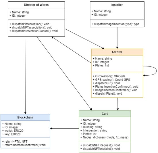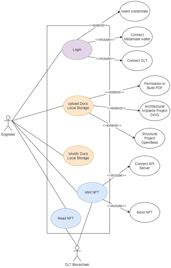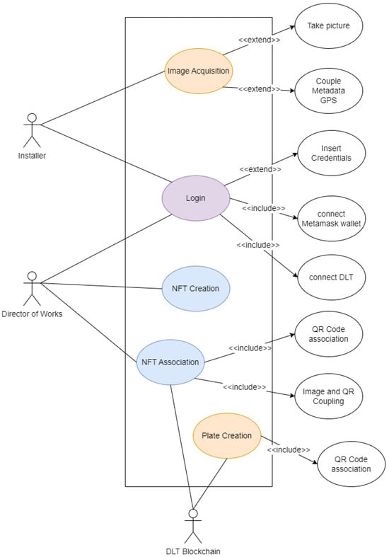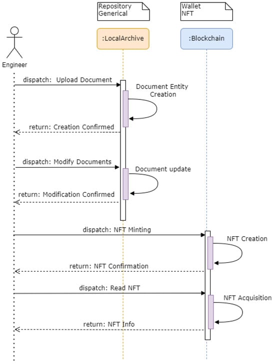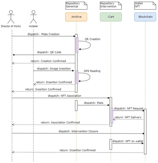 Each intervention necessitates the formulation of a detailed project report, which must be submitted to the appropriate regulatory authorities for approval. Additionally, certified professionals must oversee the execution, documenting the process with reports, photographic evidence, and compliance certificates, ensuring adherence to building codes and safety regulations. Figure 1 presents a simplified model outlining the interventions and associated activities involved in integrating NFT and DLT elements. The model comprises four main phases that span the entire life cycle of the construction site: (i) opening activities where products and components to be installed are prepared and tagged with a unique QR code, (ii) the execution of works where installation activities are carried out by installers, (iii) documental Digital Twin creation, which includes the preparation of all relevant files and metadata that are finally minted during the final phase, and (iv) the finalization of works phase, during which documents are registered on the InterPlanetary File System (IPFS) system and NFTs are minted to create a digital artifact that serves as a twin of the building structure, encompassing its associated documents and field data.