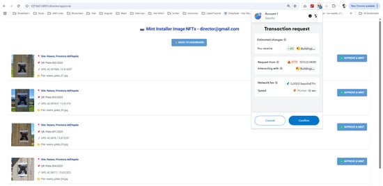 - Request 4: Utilize NFTs for data storage and timestamping: NFTs will store data such as Global Positioning System (GPS)-referenced images or cryptographic hashes linked to intervention records. By timestamping the registration of modifications on the blockchain, we create a transparent and permanent ledger that enhances accountability in the construction and renovation process.
