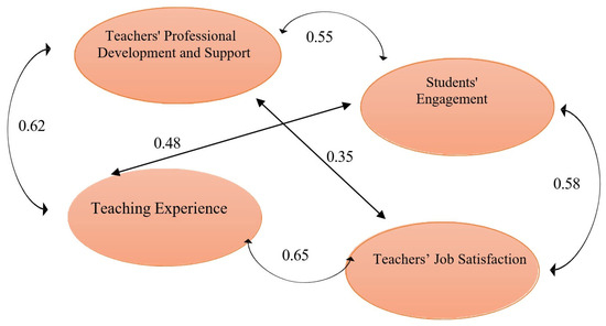 “Teaching Experience and Lack of Teaching Experience”—0.78, “Teachers’ Professional Development and Support, and Lack of Teacher’s Professional Development and Support”—0.73, “Students’ Engagement and Students’ Disengagement”—0.74, and “Teachers’ Job Satisfaction and Job Dissatisfaction”—0.80.